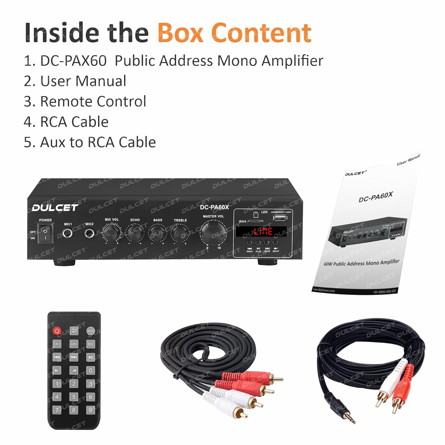 Dulcet DC-PA60X 60W High Power Mono Public Address Amplifier Box ContentDulcet DC-PA60X 60W High Power Mono Public Address Amplifier Box Content