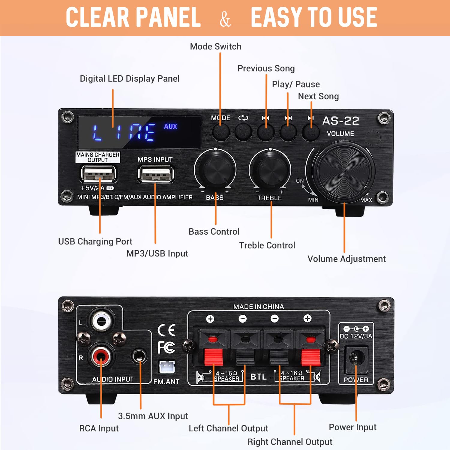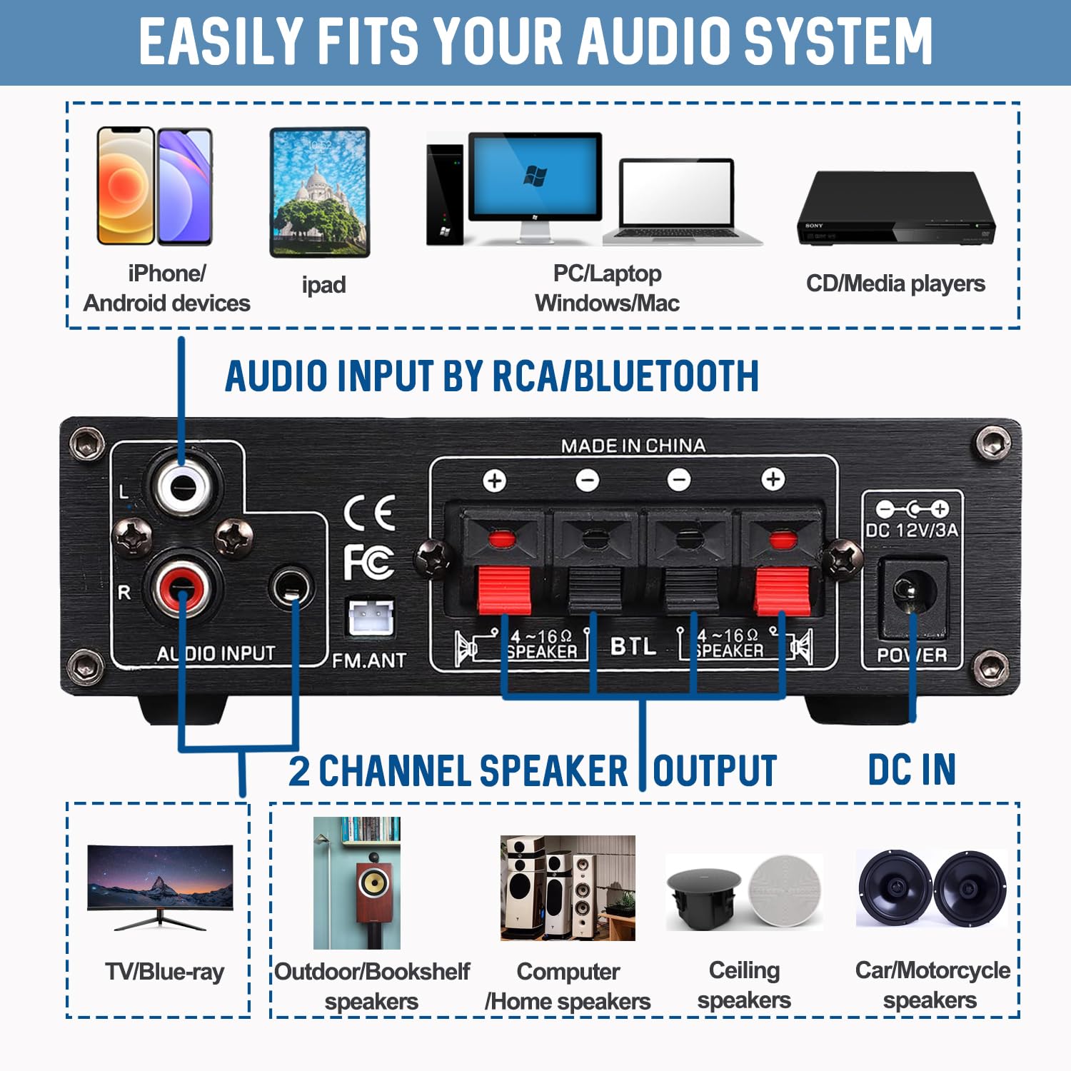 Wide Application: The stereo amplifier supports various external signal sources. 2 pairs RCA audio inputs, 3.5mm AUX, USB2.0, Bluetooth 5.0 and FM radio. Recommended for home audio systems, computer game sound systems, outdoor speakers and garden speakers